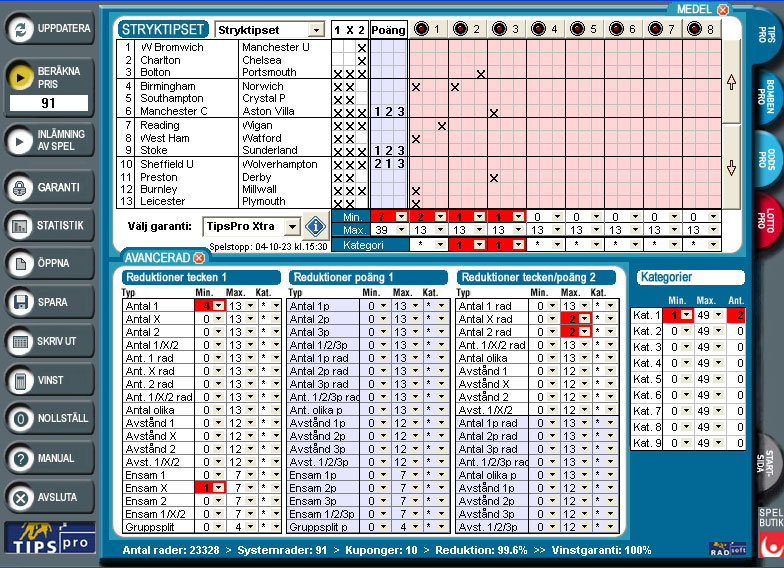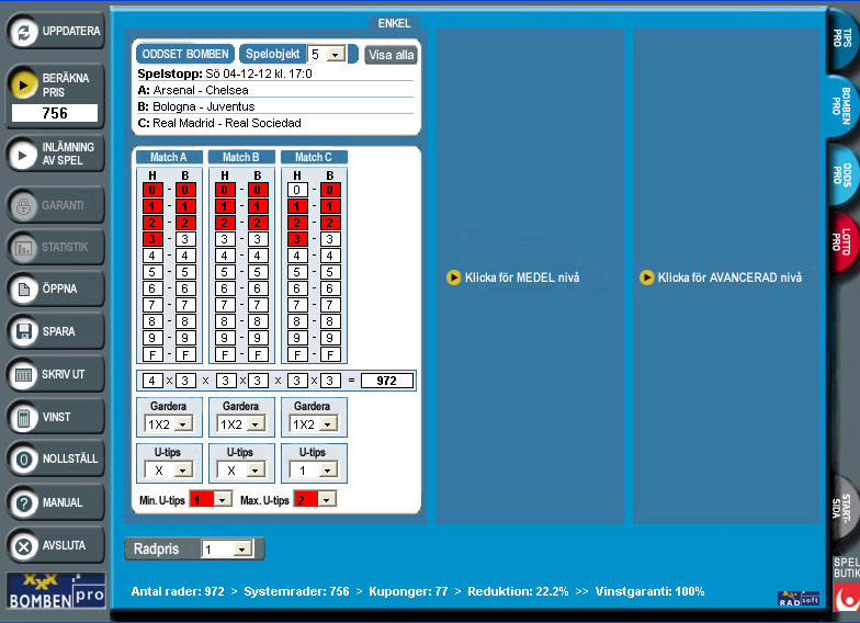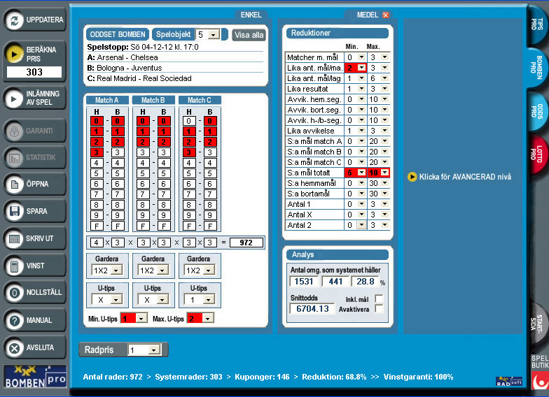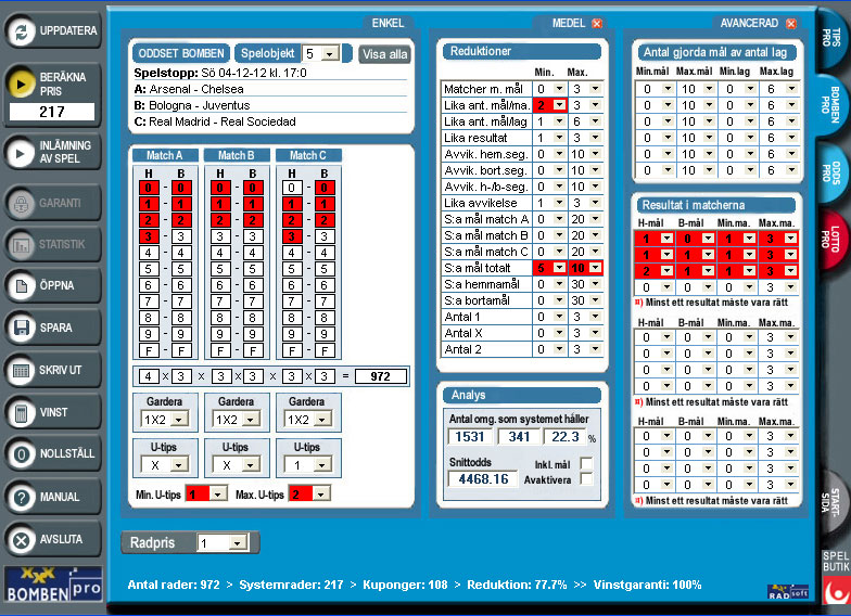 Alla funktioner i en enda programbild gör att man får en mycket bra översikt över systemuppställningen i BombenPro. Programmet har många effektiva och spännande reduktioner på matchresultat, garderingar och utgångstips. BombenPro har även en garantireduktion som kan spelas i steg från 5 till 100 %. Min./max. antal gjorda mål av lag och min./max. antal mål i matcher ger kraftfulla prisreduktioner med fortsatt bra vinstchans. Analys- och statistikmodulen gör att du kan kontrollera ditt system mot tidigare Bomben-omgångar under åren.