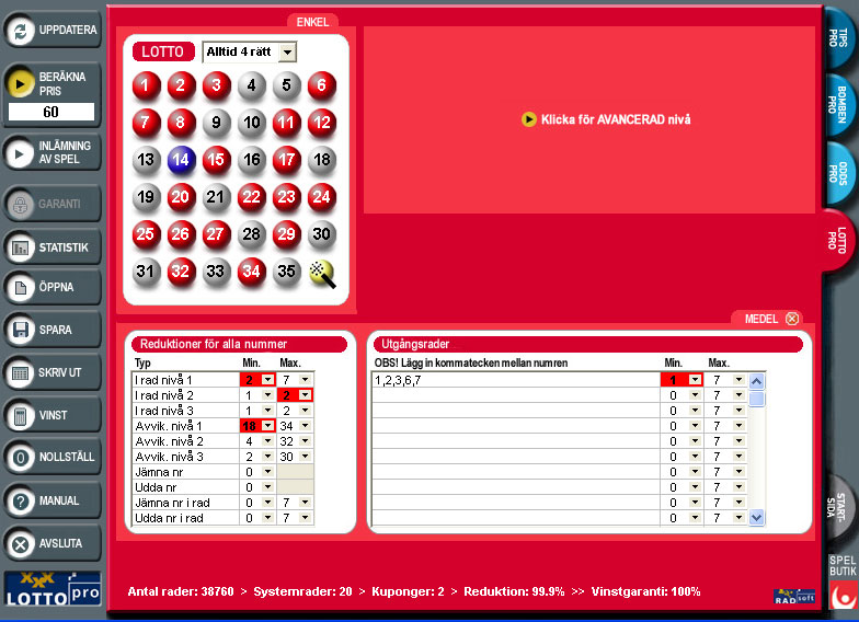 LottoPro ger dig möjlighet att få med fler nummer till ett lägre inlämningspris än vad du normalt skulle få betala. Med många nummer blir det extra spännande i dragningarna på onsdagar och lördagar! Alla funktioner i en enda programbild gör programmet mycket överskådligt. Programmet har många spännande och effektiva reduktionsmöjligheter på flera nivåer som får ner ditt inlämningspris - samtidigt som du har kontroll över dina reduceringar. Du kan spela på dina s.k. "turnummer", min./max. antal udda och jämna nummer, fyra lägsta och fyra högsta nummer bara för att nämna några av de många reduceringar som finns i programmet. Att välja mellan garantierna "Alltid 4, 5 eller 6 rätt" reducerar också priset en hel del. Du kan använda upp till 70 stycken utgångsrader och även spela kategorispel på alla reduktioner som du har använt dig av i systemuppställningen. LottoPro har även en modul med statistik fr.o.m. den allra första Lottodragningen år 1980.