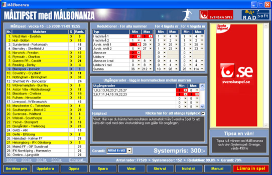 Spela måltipset smart och enkelt med MålBonanza, så förstår du snabbt fördelarna med att sätta spelet i system. PC-programmet innehåller systemspel för måltipset, med anpassning för inlämning av spelet över internet till Svenska Spel.